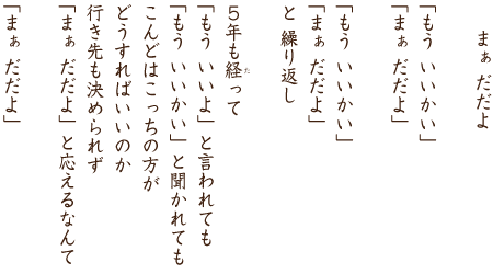この詩の前半は、別の詩を読むと、このおばあちゃんの事情が解ってきます。この地域では3世代同居が当たり前で、震災前は嫁や孫たちに恵まれ幸せに暮らしていたのですが、避難解除の時が近づき、もとの生活が取り戻せるとばかり思っていたところ、お嫁さんから上機嫌で「おかあさん、施設が決まったよ」と言われて愕然としたという内容でした。後半は藤島さんがシェアハウスを作ろうと奔走する思いの原点が感じられて、涙がこみ上げました。