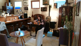 時間は、1:30から3:00までがコンサート、その後4:30まで懇親会です。1時間半で10曲歌うことにしたので、MCの時間はたっぷりありました。マイクなしで皆さんのお顔を真近に見ながらお話ができるし、皆さんの方でも気楽に受け応えできるような雰囲気だったので、私としても今までで一番いろんなお話が出来て、思うようなセラピーコンサートをすることが出来ました。皆さまからも、私自身の体験を通した歌なので、言葉がすごく心に入ってきたと、喜んでいただくことができました。一番前で聴いておられた方が、オリジナルの「心の花」をとても感動してくださって「一生忘れない」と言っていただいたことが、一番嬉しかったです。