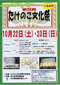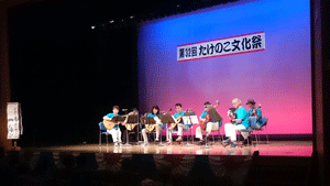 もう2週間以上も経ってしまいましたが、10月23日に竹の子文化祭があり、私が指導に行っているギター弾き語りサークル「円むすび」が参加しました。2007年に、足立区教育委員会・竹ノ塚地域学習センターに指導に行くようになってから毎年出演しています。たくさんのサークルがあるので、2日間にわたって催されます。センター全体には絵や手芸などの作品が展示され、4階ホールでは音楽や舞踊などのサークル発表会があります。
