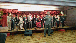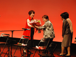おもいがけないハプニングがあったのは、島田さんとデュエットの時に、島田さんのご両親が私のファンになってくださって、何度かコンサートに来ていただいたお話をしたときのことです。2年前にお母様が亡くなられましたが、ご病気の時も、棺の中におられたときも、お母様のために私が歌いに行ったことや、お父様が来年100歳なのに会場に来られていると言うお話をしていたら、なんとお父様がお母様の写真を掲げて見せてくださったのです。会場の皆さまも喜んでくださいました。島田さんはそんなこと知らなかったと、あとで驚いていました。もうひとつのハプニングは、全曲終了したら、竹ノ塚の合唱奏サークル「円むすび」の皆さんが花束贈呈という段取りになっていました。てっきり舞台から持ってきてくれると思ったら、まだ客席に座っていたので、舞台の方に廻る様に合図をしました。ところがなかなか時間がかかってしまい、間が抜けた状態になってしまったと思いましたが、ビデオを見たら、私が「花束さあ〜〜ん」と呼んでいて、客席の皆さんも和んでいる感じだったのでホッとしました。スタッフの指示がいき届かなかったために、円むすびの皆さん、ごめんなさいね。
