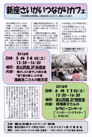 それから、かねてより近藤さんから、新座に福島から避難している方がたくさんおられて、ネットワークがあるということを伺っていましたが、6月11日に「新座さいがいつながりカフェ(右のチラシ)」の活動の中で「セラピーコンサート」をすることになりました。5日に世話人をされている谷森櫻子さんにお会いするために新座に行ってきました。近藤さんが車で出迎えてくださって、コンサートをする公民館に行きました。谷森さんからいろいろお話を伺いましたが、避難されておられる皆さんも、とても大変な状況にあることを知ることができました。