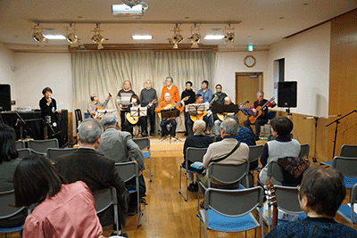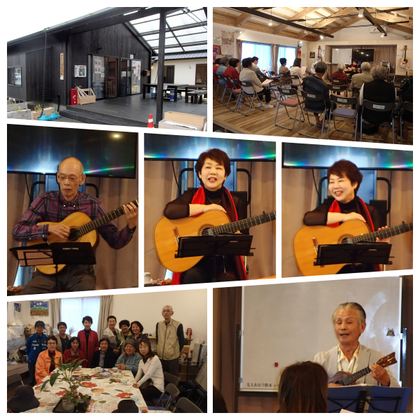 | 上左:みんなの家 上右:「歌とお話の会」 中左:山浦さん弾き語り 下左:懇親会でみなさんと記念写真 下右:池上さんウクレレ弾き語り |