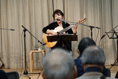 実際ライブが始まってみると、大体想定内の人数での「歌とお話の会」になりました。興味を持って集まってくださった方たちなので、私のお話にも皆さんうなずきながら、歌も良く理解して共感して下さっている感じが伝わってきて、私自身もとてもリラックスして進めることができました。山浦さん、池上さんの特別参加の後は、いつものように「時代を越えて」を皆さんに覚えていただき、みんなで歌って盛り上って終了しました。
