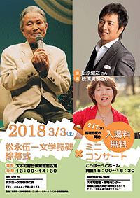 私は松永先生には生前いろいろとお世話になっておりました。今私の支援の会の代表、事務局を担ってくださっている山浦さん、近藤さんは、松永先生が郷土の花宗中学の先生をされていた時の教え子の方達です。そして、記念詩碑建立の実行委員長の鳥取英紀さんは、私が気仙沼や南相馬に慰問コンサートに行った時に同行して下さった方です。そのような関係から、除幕式の時には、記念碑の前で、松永先生がとても気に入ってくださっていた「あじさい」を私が歌うことにしたらどうかというお話が持ちあがりました。そうしているうちに生前大変可愛がっておられた歌手の松原健之さんも歌って下さるということになり、それならばホールを使ってちゃんとしたコンサートにしようということになりました。そのような経緯から、掲載のポスターの内容のコンサートが実施されることになり、3月2、3、4日と九州に行ってきました。